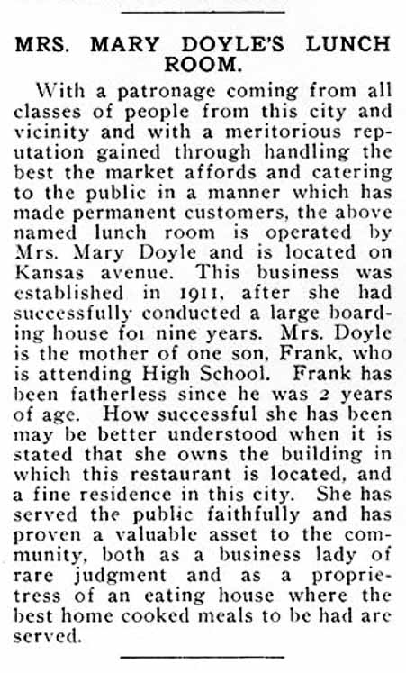 Mrs. Mary Doyle’s Lunch Room – With a patronage coming from all classes of people from this city and vicinity and with a meritorious reputation gained through handling the best the market affords and catering to the public in a manner which has made permanent customers, the above named lunch room is operated by Mrs. Mary Doyle and is located on Kansas Avenue. This business was established in 1911, after she had successfully conducted a large boarding house for nine years.
