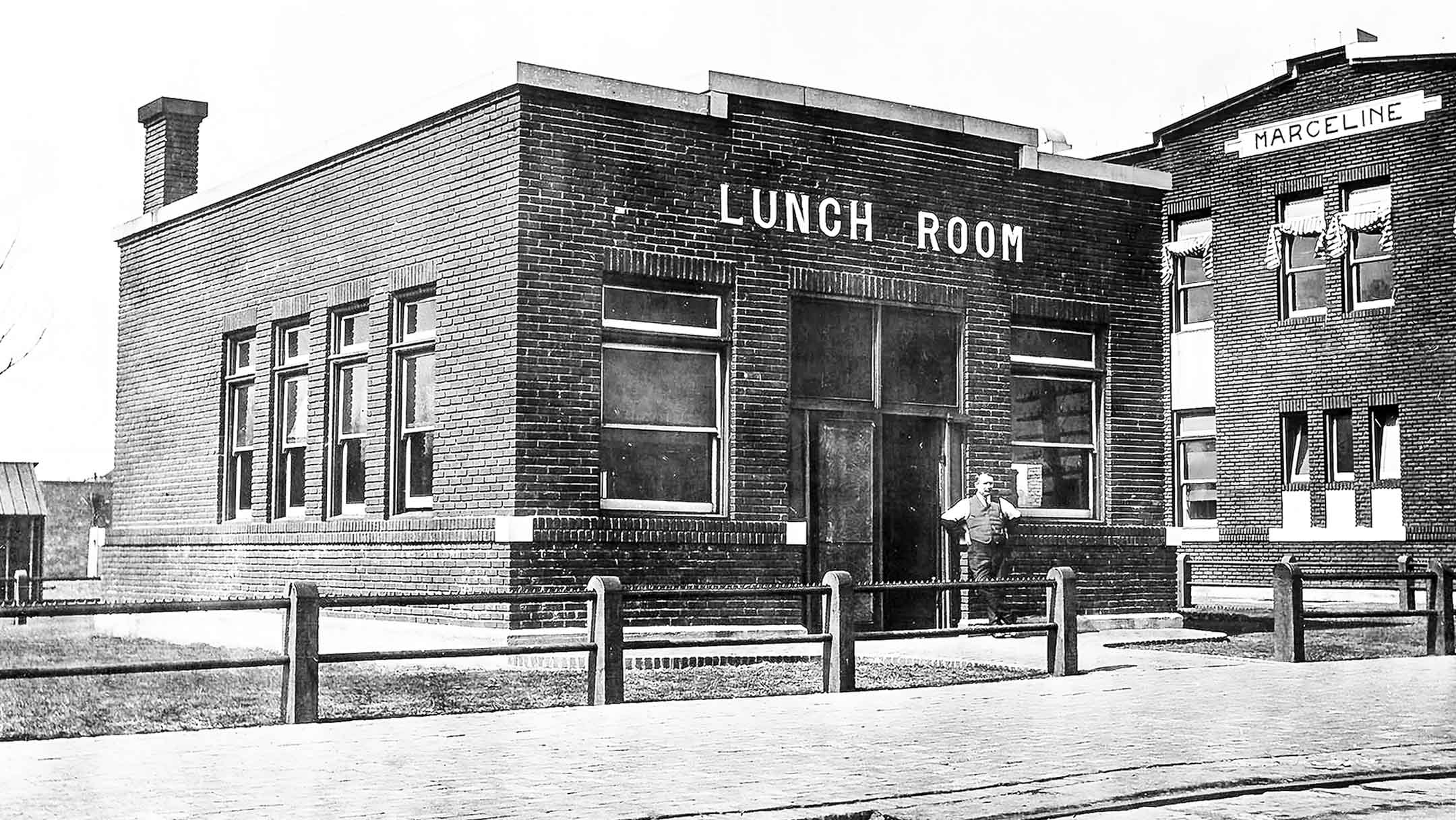 A public Lunch Room had been located in the original wooden Marceline depot since 1908. When the new brick Depot was dedicated in 1913, local businessmen began to draw up plans for a new lunch room. This was not an easy proposition, as the Santa Fe Railroad owned the land that the building would occupy, and would lease the land to the lunch room owners. It was essential that the new lunch room be of similar design and quality as the new Depot. Once plans were drawn up, a Santa Fe architect was consulted. After a few months of discussions, drawings were approved and it was time to start building.