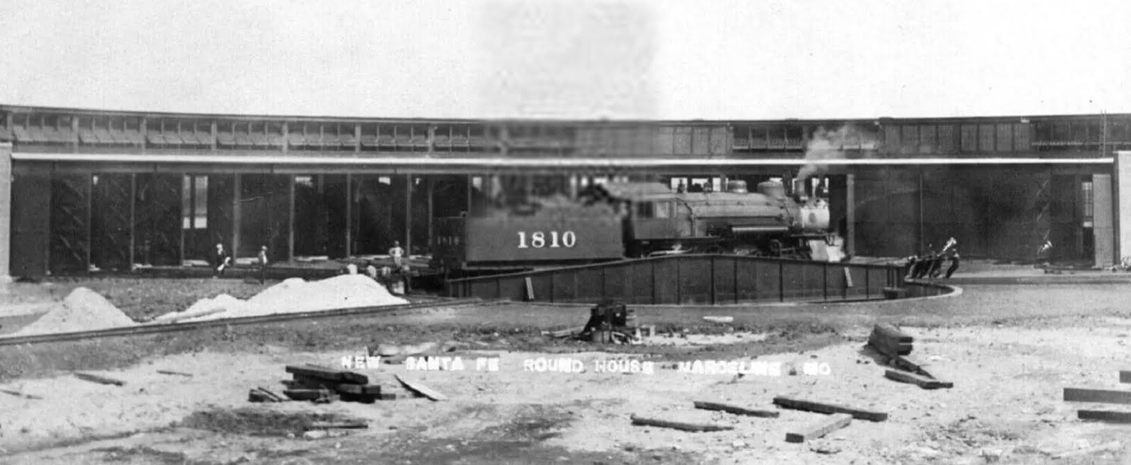 The Marceline roundhouse was located on the east side of the main yard and was accessible from the east bound track. there are very few photos or drawings of it. The aerial view shows the “footprint” of its foundation. The roundhouse had a steam boiler to feed steam to the parked locomotives so they could be used immediately year around.